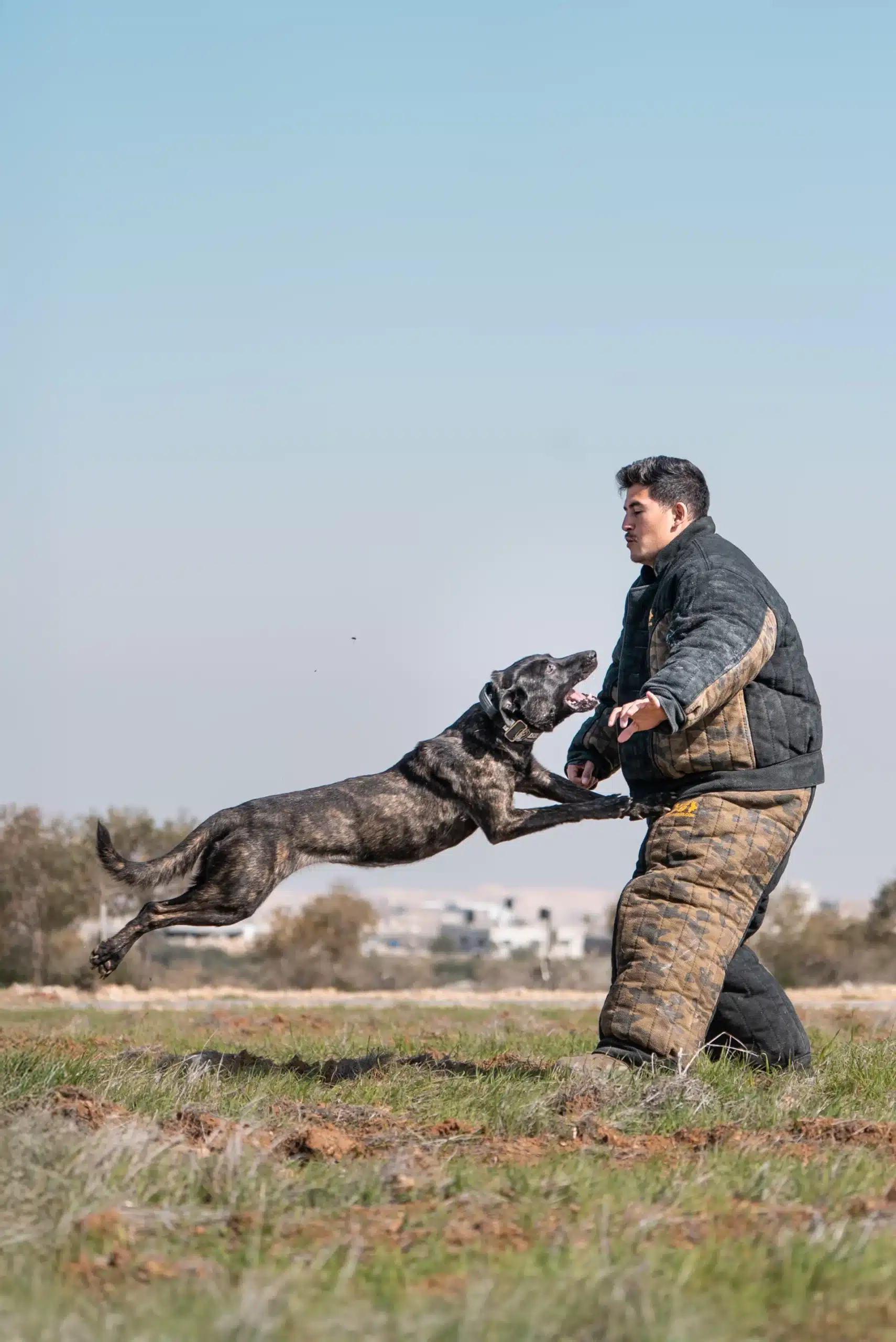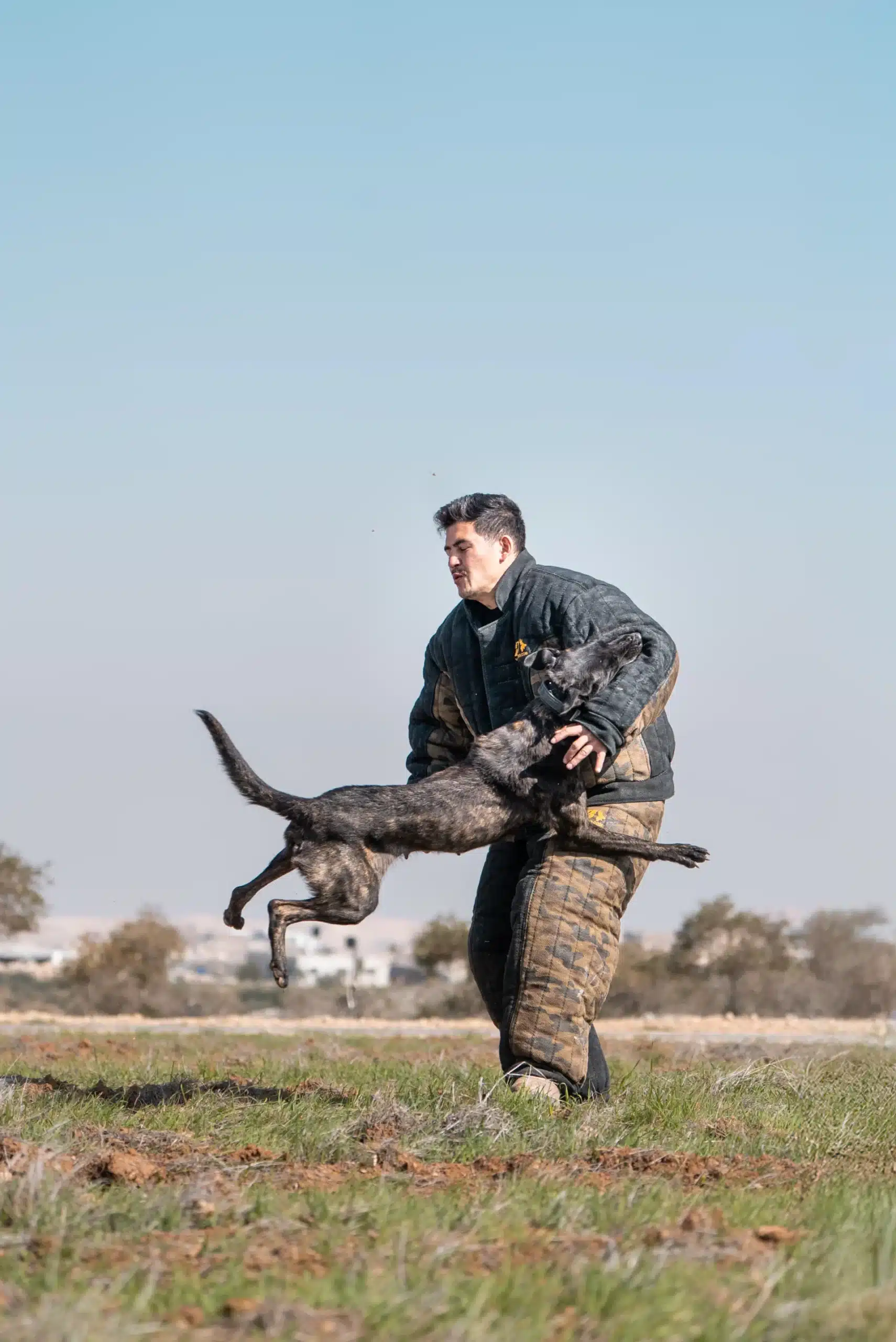 Training begins with establishing confidence in the bite, fostering a dog that enjoys the work, seeks to maintain control of the equipment, and grips with a full, calm mouth. Puppies are introduced to chasing, committing to targets, and holding without chewing or slipping. As development progresses, training incorporates increasingly complex scenarios, including different surfaces, locations, stairs, vehicles, narrow spaces, and open fields. The dog learns that biting is a controlled skill applicable in any environment, not solely on a perfect training field.